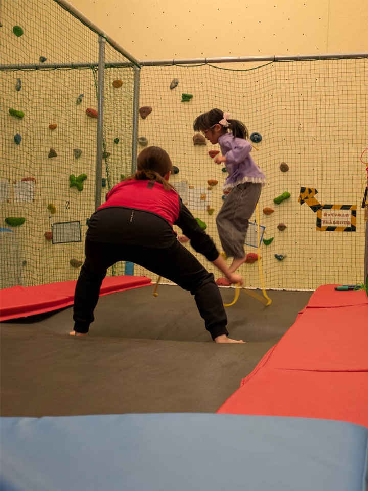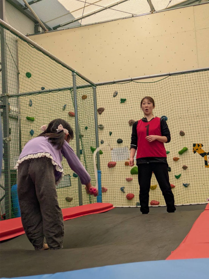 その次は大好きなトランポリンでの練習です。まずは膝を伸ばしてふくらはぎを使う跳び方を覚えてもらい、同じ場所でずっと跳べるようにする練習です。楽しくてあっちこっちいってしまうのも最初は仕方がないこと!でも、参加してくれた子はずっと笑って楽しく跳んでいました。楽しく続けてくれるのが、上達のコツでもあります。