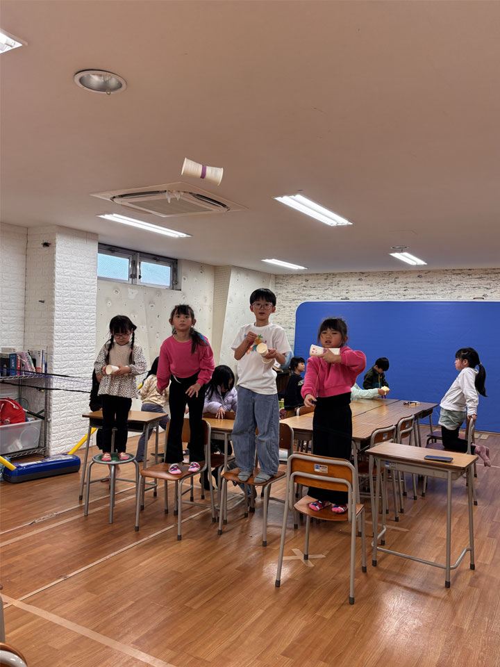 紙コップを張り合わせて輪ゴムで飛ばす工作ですが、小さい子には少し難しかったようです。それでもハマる子にははまり、どんどんとコツを掴み上手に的を目がけて当てるように飛ばしていきました。