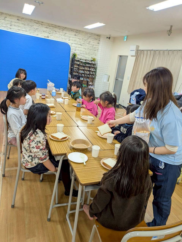 ゆか先生が片付けをしている間、管理棟内ではゆうき先生によるクイズ大会と、事前にせりな先生とあんな先生に隠してもらったお菓子を探すゲームをしました。お昼ご飯が一瞬で終わってしまったせいか、みんな「お菓子食べていい?」と聞いてきたので、お土産だったお菓子もその場で食べることになりました。