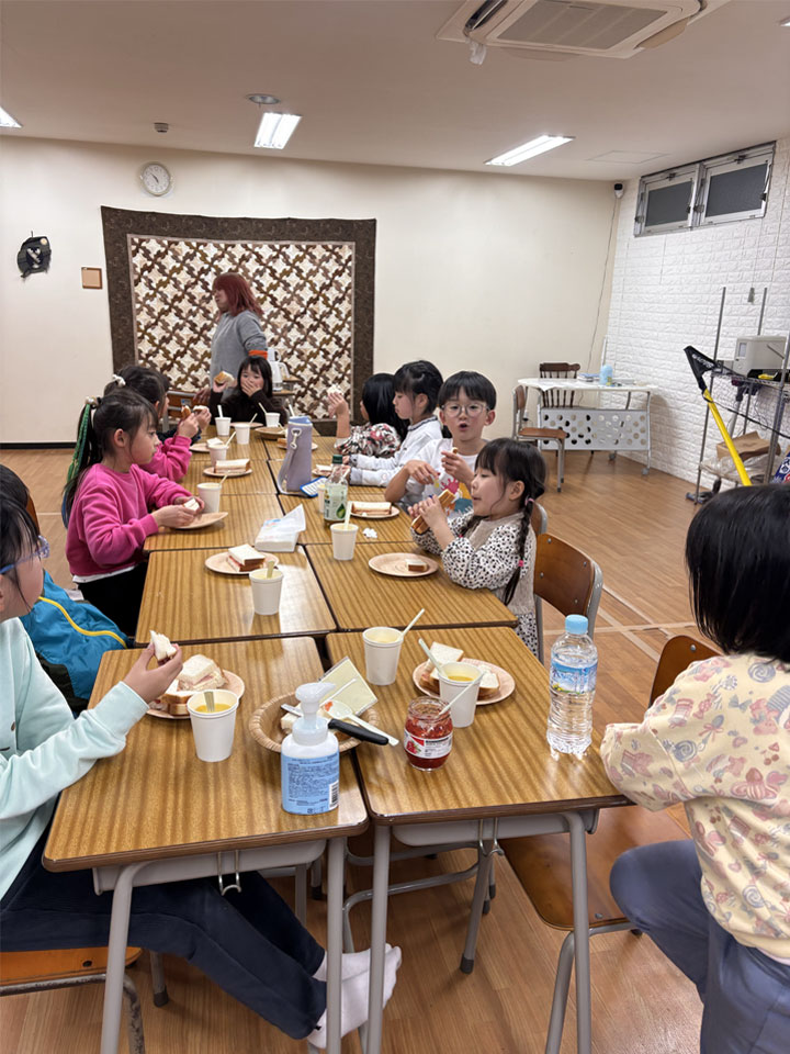 そして…デイキャンプ2食目の夕飯はみんなでサンドイッチを作りました。ペアの子と2種類のサンドイッチを交換していただきます。お腹が空いている子が多かったようで、お代わりをしてスープもしっかり飲んでいました。