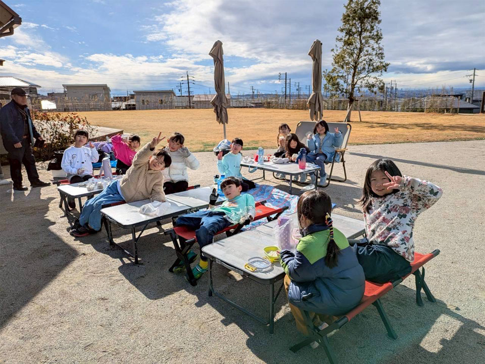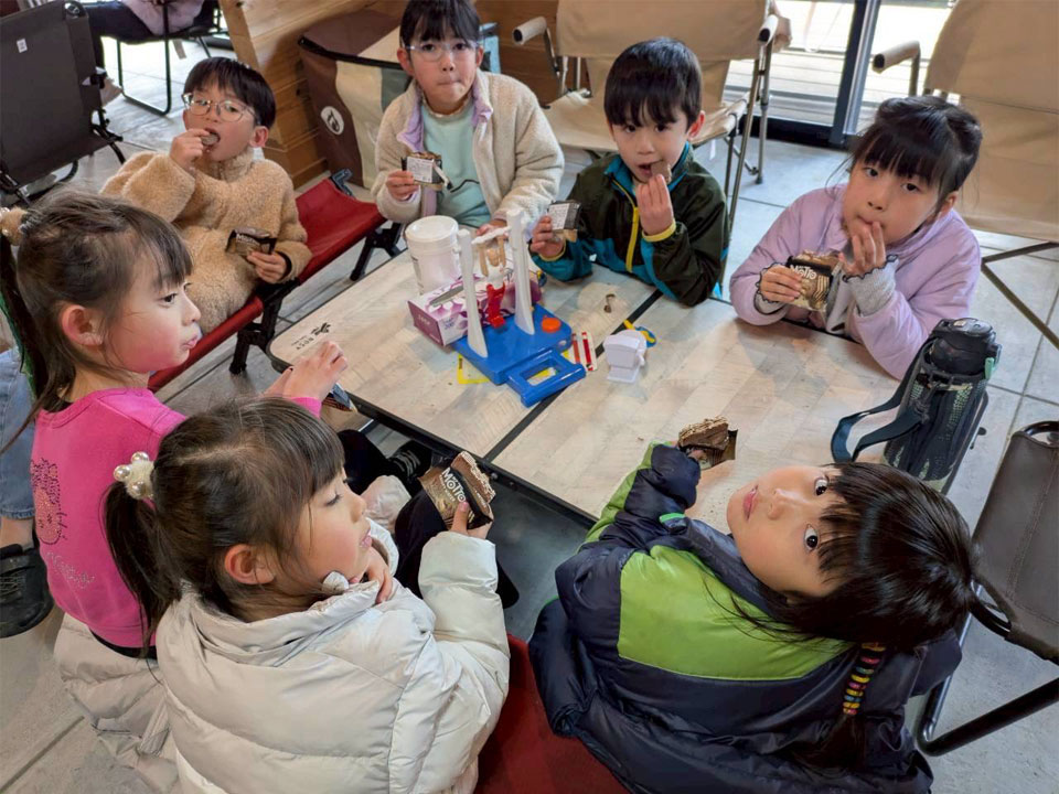 少し食べて満たされると食欲より寒さが増し、管理棟へ入ったり走り回って鬼ごっこをしたり、先生たちは順番に食べたり遊んだりをしていました。