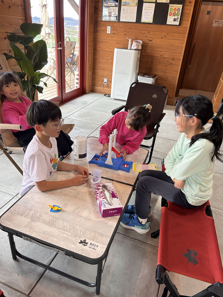 一方で、自由に遊ぶ子どもたち…カードゲームや教室にあるキックボードやスケートボードで遊んだり、風船を膨らましてバレーをやる子などもいてお友だちと楽しく過ごしました。