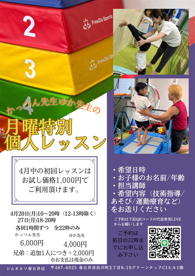 4月からジムオルソ春日井店でやる月曜特別個人レッスンについて、少し詳しくご紹介したいと思います。これまで通り月曜日に1時間枠ごとで担当先生を指名して技術指導やあそびをご提供していきます。