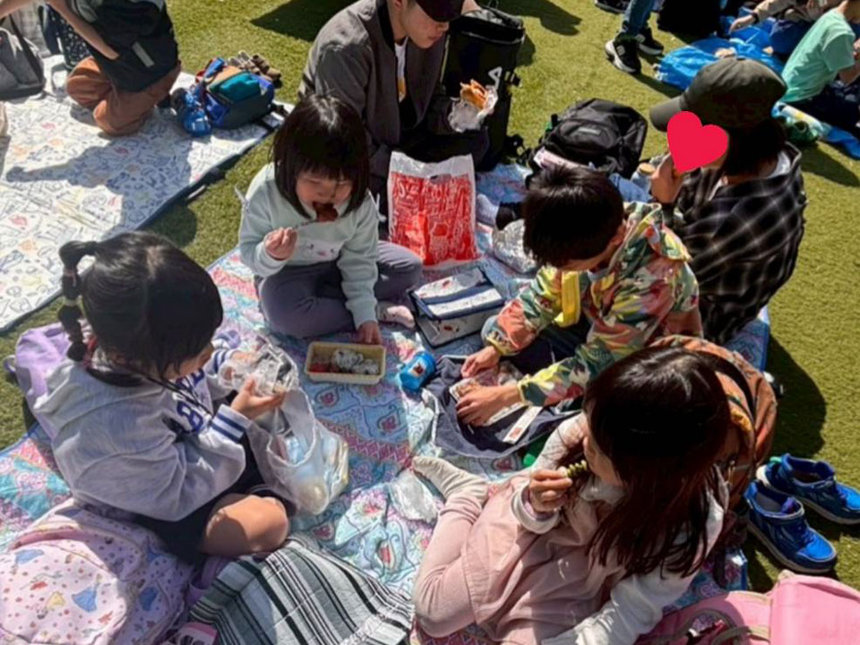 11時頃にはお昼準備のため、管理棟の方とかっつん先生でBBQ(バーベキュー)の準備をしてくれました。初めて利用した高森台walkable parkフルットでは、施設の方が朝からみんなが使うテーブルと椅子をたくさん用意してくれ、火を起こしてくれました。至れり尽くせりでありがとうございました。