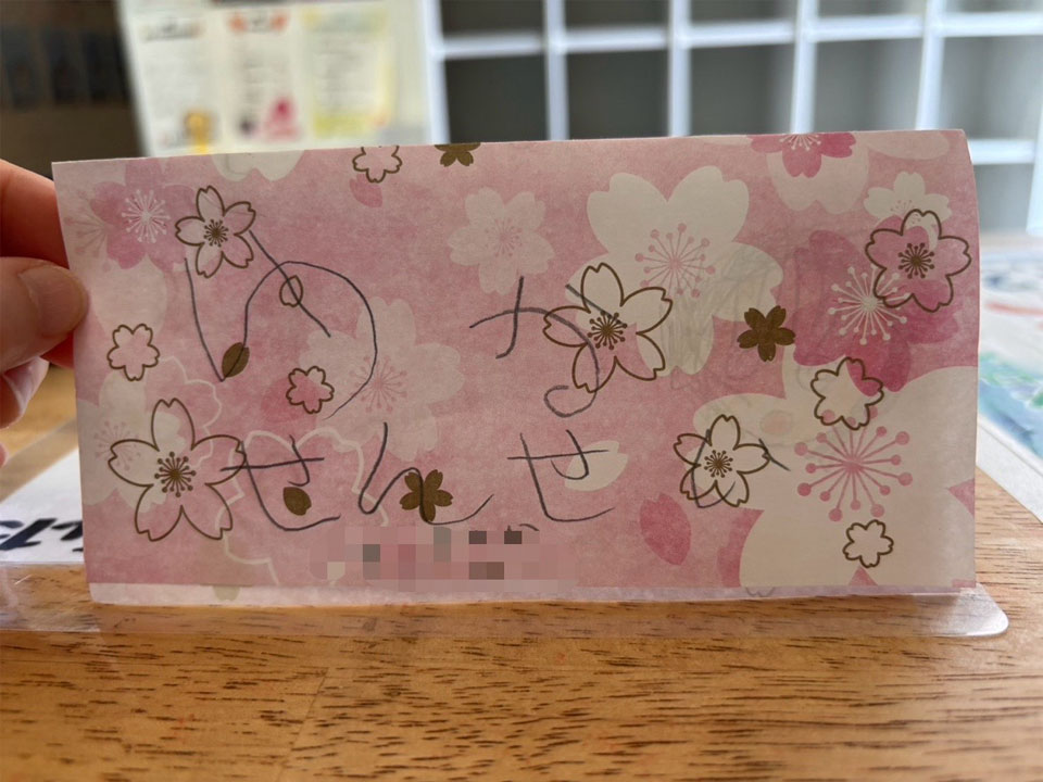 はじめて小さな女の子が、ゆか先生の出勤でない日に持ってきてくれました。綺麗な桜の折り紙にメッセージと似顔絵が書いてありました!