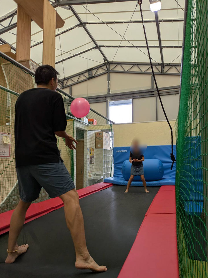 またまたお客さんでらいふに来た時のことですが…息子と一緒に大きいトランポリンでガムテープタッチチャレンジをしました。壁にあるメジャーのところにくるっと丸めたガムテープを、最高到達点で貼るという遊びです。