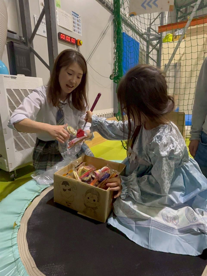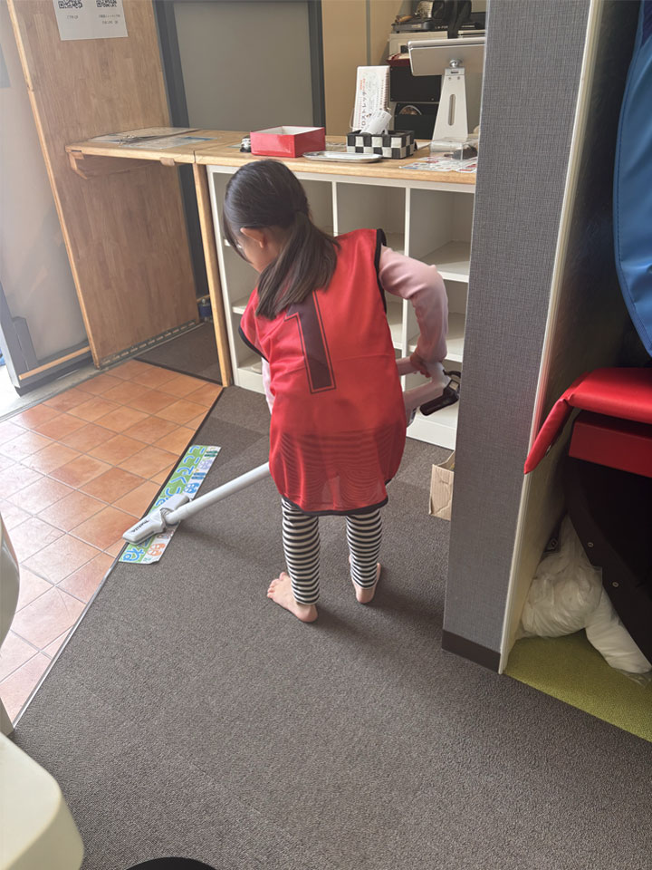 まずは先生のユニフォームである赤いビブスをつけてもらい、掃除機をかけ、挨拶の練習をして、大きいトランポリンで準備運動をしてもらいました。そして、お客さんが来る頃、受付に入ってもらい、かっつん先生の隣でスタンプカードを押すお仕事を手伝いました。お客様に挨拶するのは恥ずかしいようで、表情もまだ硬いままでした。