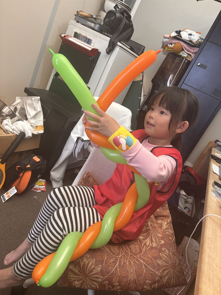 その後は事務所に入り、バルーンアートの制作体験です。パフォーマンスも大事なお仕事ですので、長い風船を膨らまし、ハートとねじねじリースを作りました。