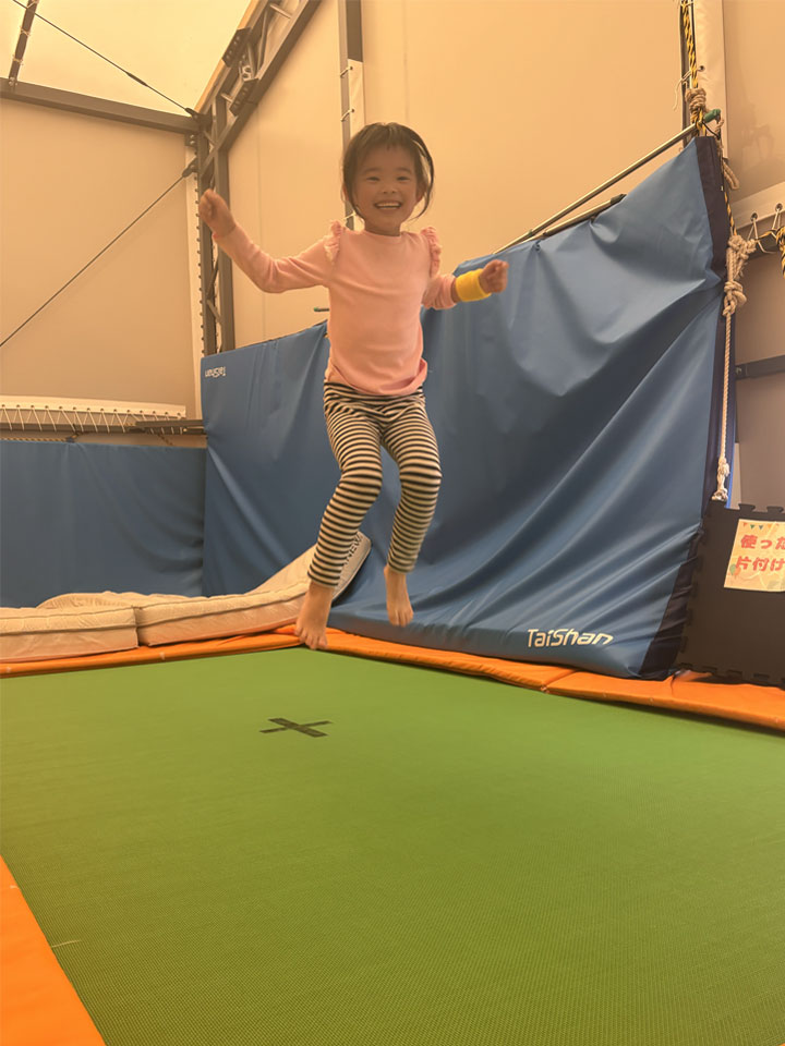 曇り空の中、最初のお客様が到着。まずはトランポリンで前宙をやったり逆上がりに挑戦したりして、1時間しっかり遊んでいました。遊び終わると外の会場へ駆け足で向かいます。