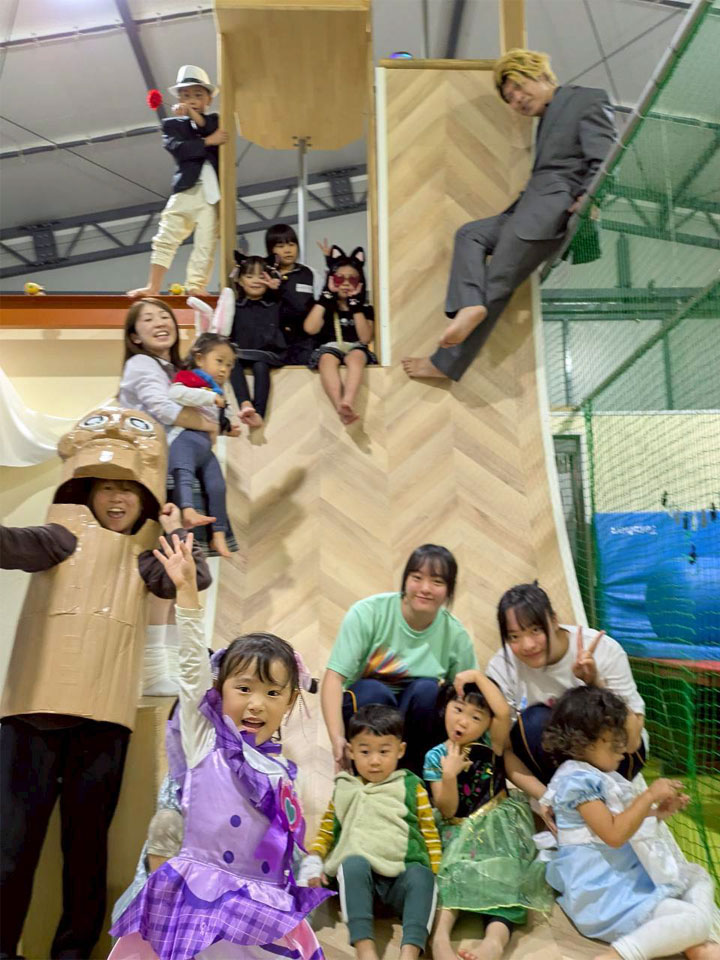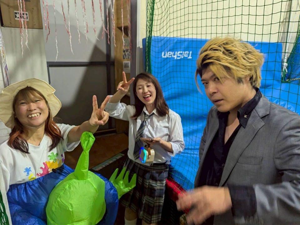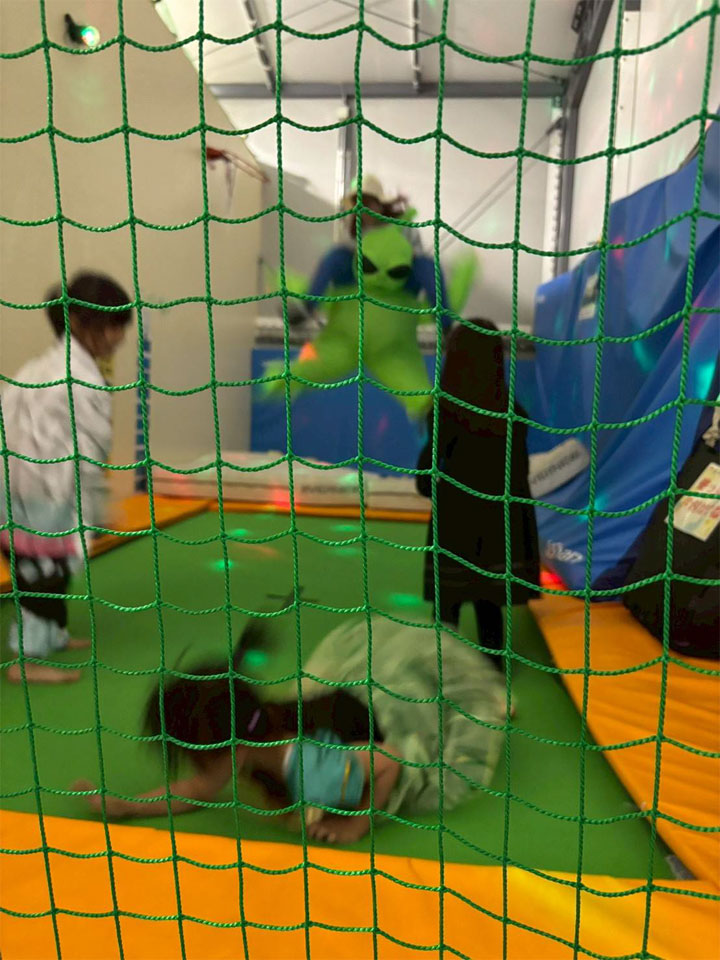 この日のとび箱エリアはクモの巣がはりめぐらされていて、引っかからないようによけていくとお楽しみタイムの招待状がもらえる…という仕掛けをつくり、赤いトランポリンにはパン食い競争を感じさせるようなおばけがたくさんぶらさがっていたり、大人気の大トランポリンではミラーボールによってギラギラに照らされていました。