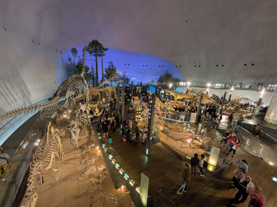 そのあと午後からは、息子くんが気になっていた「恐竜博物館」へ。入館すると、近未来的な建物で圧倒されました。「これなに?」が「これは〇〇だねー」とたくさん言葉が出てきて大はしゃぎ!!大人のわたしたちも「なにこれ?!」「これ恐竜?」「象を見えるけど鼻が裂けて上唇と下唇になってる」と、ついつい興奮してしまいました。
