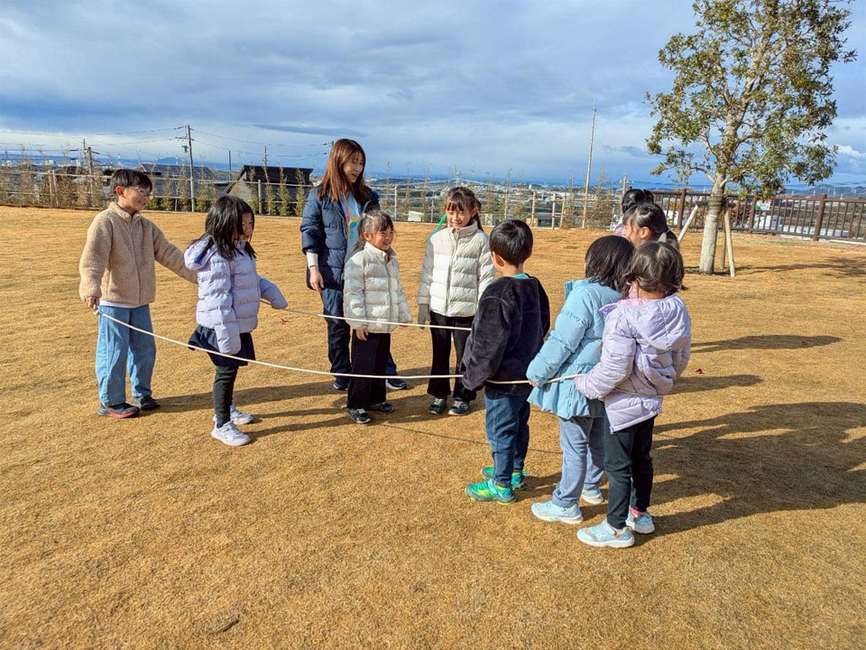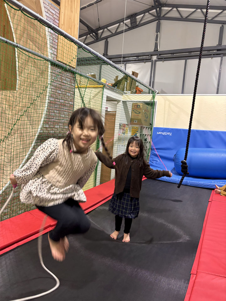 大縄をするグループ、バドミントンのシャトルを隠して身代わりかくれんぼをするグループ、管理棟の中では体操選手を模したおもちゃで爆笑が起こったりと、それぞれで楽しく遊びました。寒かったので、施設の様子を見ながらマラソンもしました。