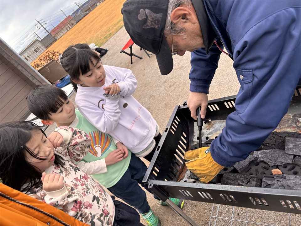 その様子を子どもたちは興味津々で見ていました。そして少し早めだったのですが、「お腹すいた〜」とお家で用意してきてもらったおにぎりをお肉が焼ける前から食べだしていました。