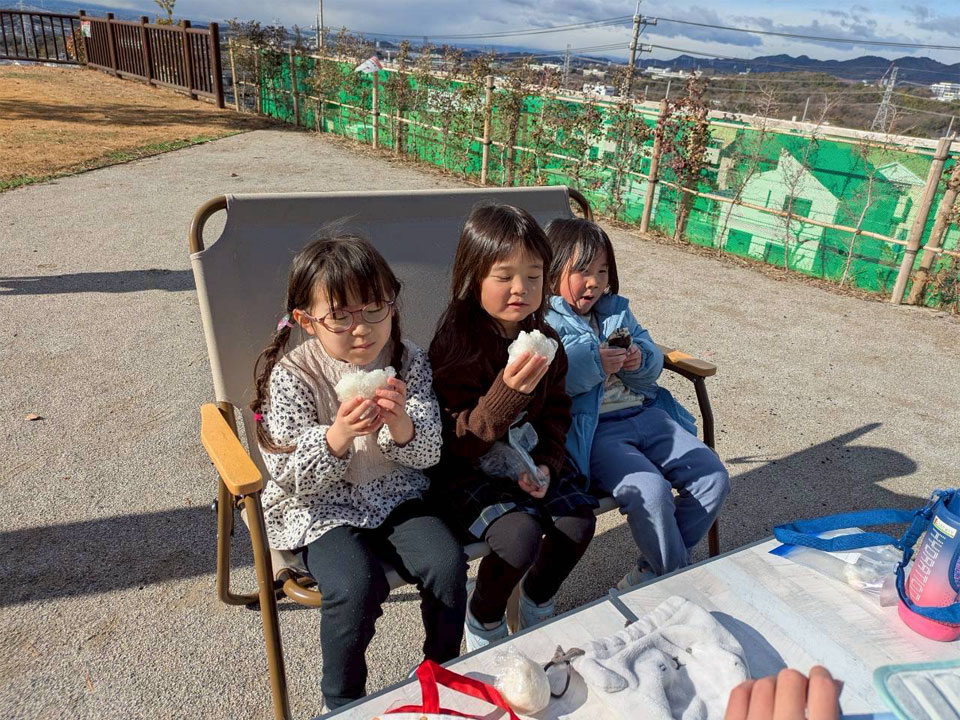 少し食べて満たされると食欲より寒さが増し、管理棟へ入ったり走り回って鬼ごっこをしたり、先生たちは順番に食べたり遊んだりをしていました。