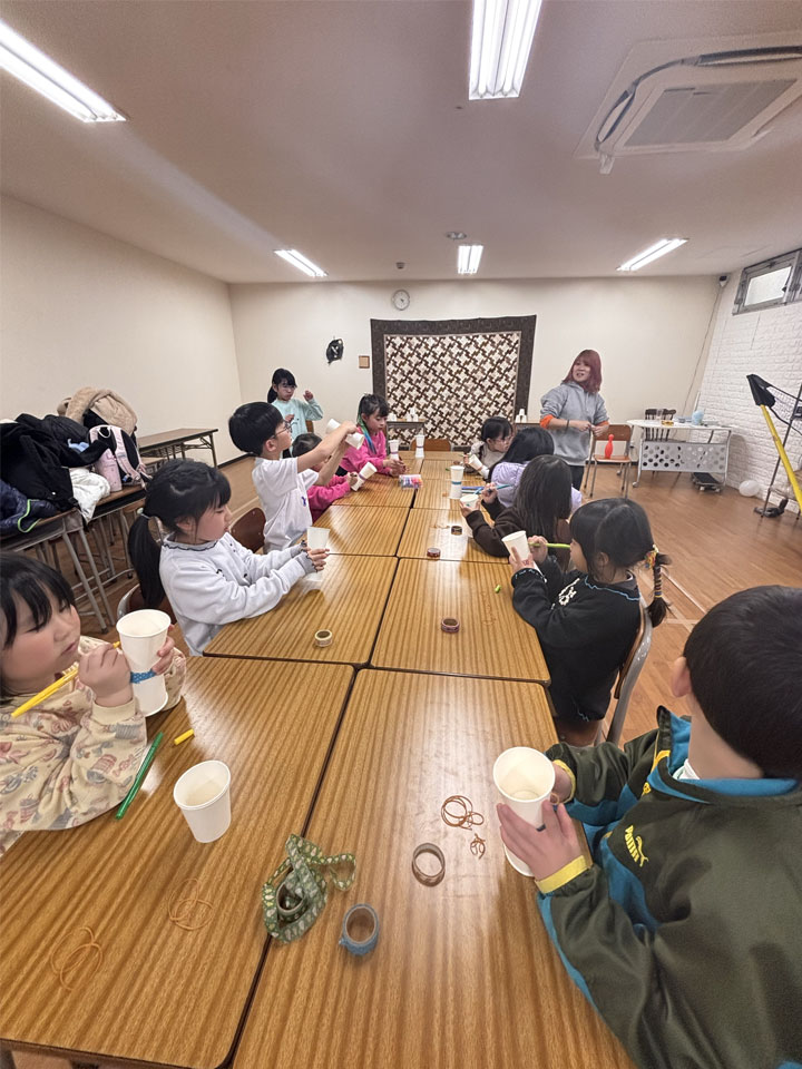 紙コップを張り合わせて輪ゴムで飛ばす工作ですが、小さい子には少し難しかったようです。それでもハマる子にははまり、どんどんとコツを掴み上手に的を目がけて当てるように飛ばしていきました。