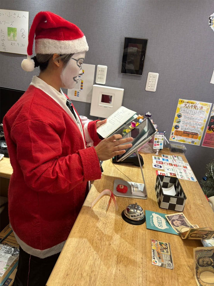 どんなことをするかというと…まずはオープン準備で電気をつけたり、お掃除をしてもらいます。そして基本的な挨拶を覚えてもらい、お客様をお迎えします。