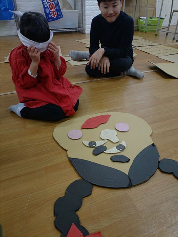 さぁ書き初めが終わると、ゆうき先生を筆頭にせりな先生とあんな先生の3人の大傑作!福笑いのおかめちゃん!!(笑) この子のお顔を、目隠しをして完成させます。