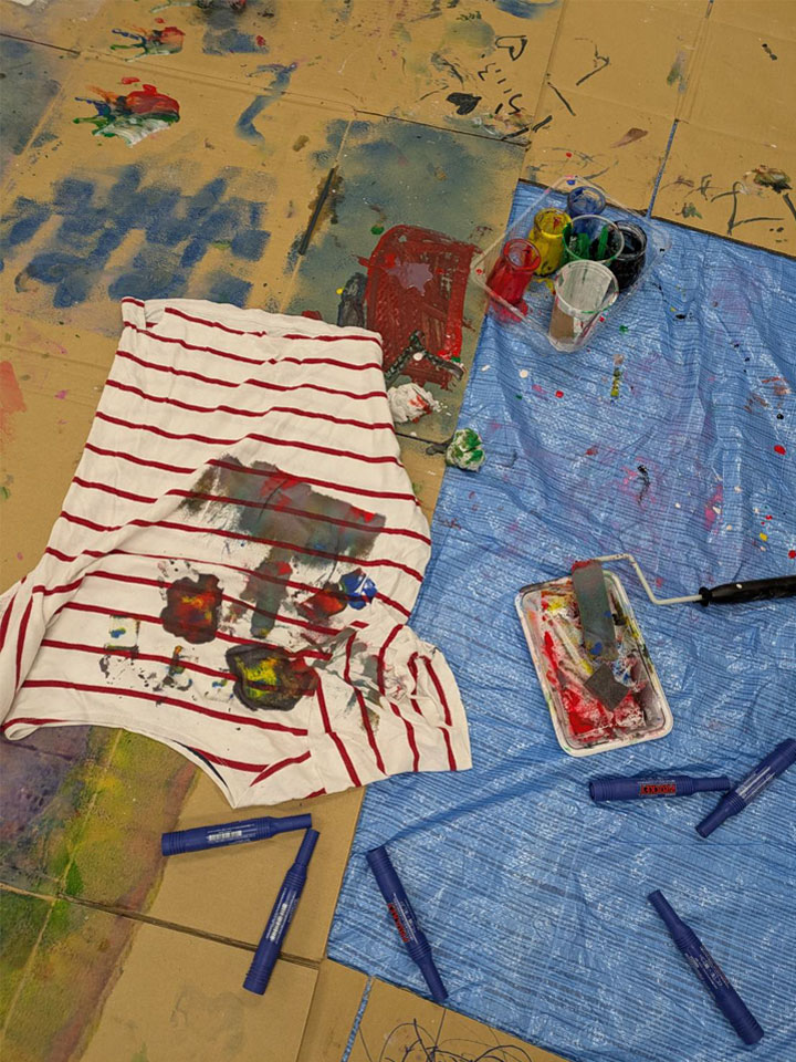 今回用意した素材は「水彩絵の具」「色水」「おむつジェル」「スライム」「廃材」「紙類」「布」、道具は「筆」「ローラー」「スポイト注射器」「おままごとセット」「ハサミ」「ペン」「テープ」「ひも」。