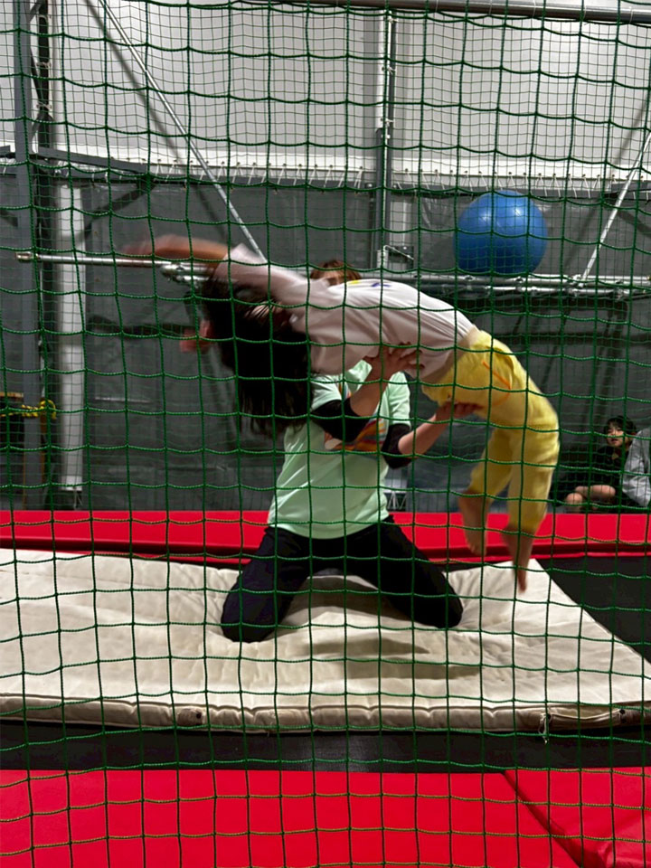 後半は、いよいよ先生達の補助でバク転の形に持っていきます。手を思い切り降って後ろに跳ぶ…という動作は難しいものです。