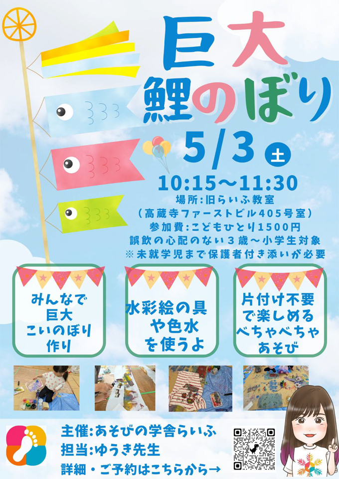 本題はここから…「今年のこどもの日は何をしようかな?」と悩みに悩んだゆうき先生、いくつかの案からみんなで「巨大鯉のぼりをつくろう」の開催を決めました!!