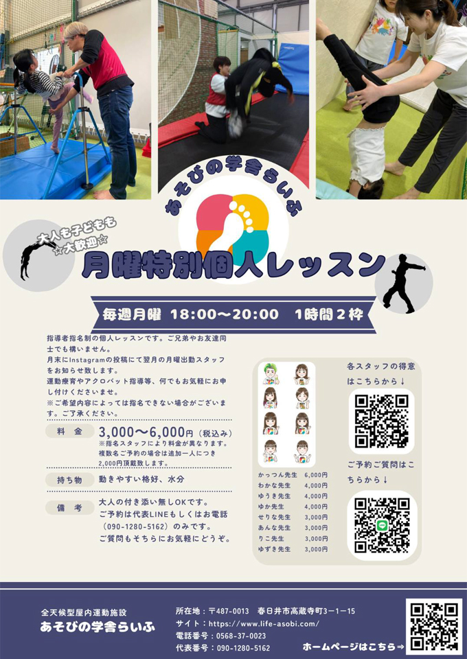 いつもらいふをご利用いただき、誠にありがとうございます。4月から新たな試みとして、マンツーマンの個人レッスンが始まります。日時はらいふ定休日の月曜18:00〜19:00と19:00〜20:00の2枠になります。完全個別指導になるので先着順となります。
