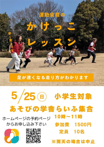 5月25日(日)に、運動会前の「かけっこレッスン」を開催します。10:00〜の開催で、参加費は1,500円です。先着10名!対象は小学生です。