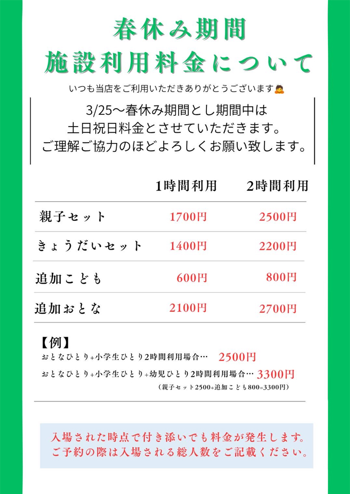 3月25日(水)〜3月29日(日)の春休み期間は「土日祝料金」となります。どうぞご了承ください。