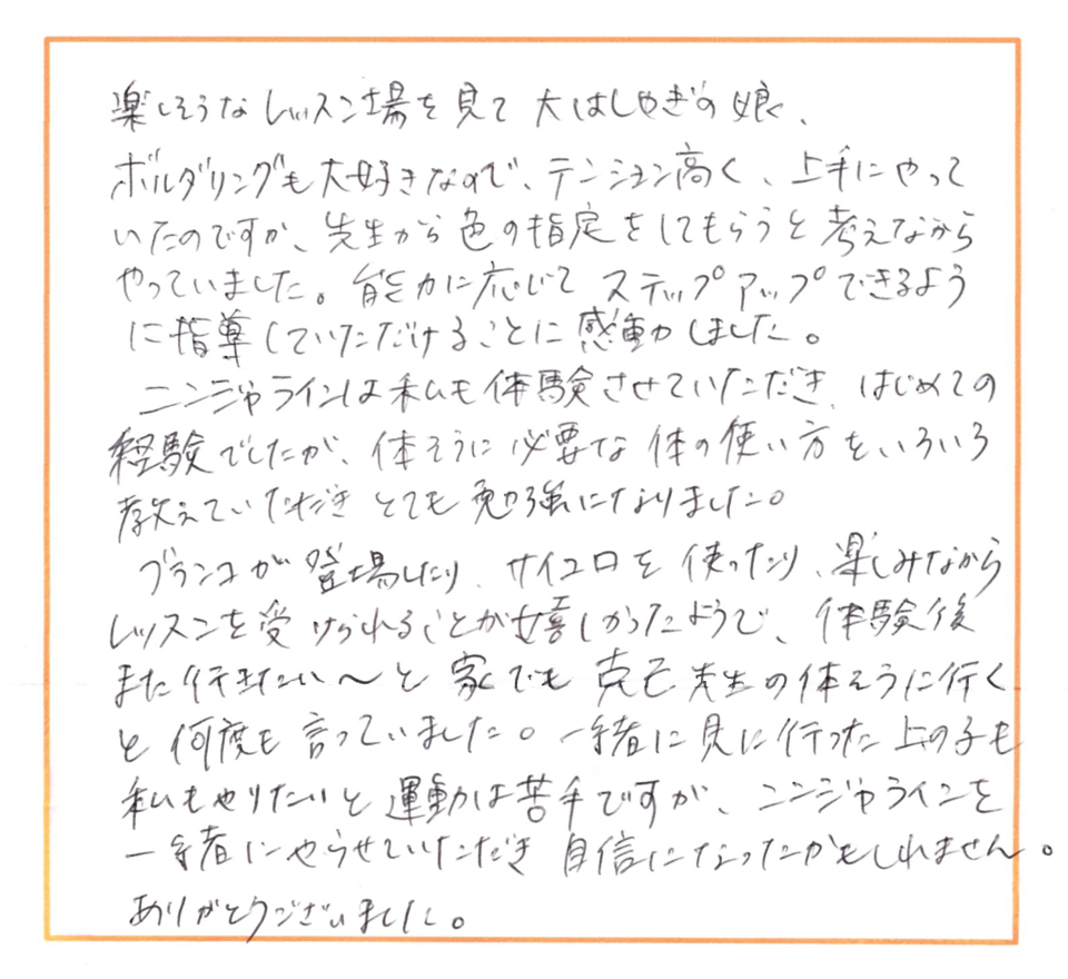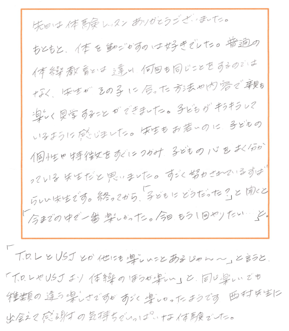 先日は体験レッスンありがとうございました。もともと、体を動かすのは好きでした。普通の体操教育とは違い、何回も同じことをするのではなく、先生がその子に合った方法や内容で親も楽しく見学することができました。子どもがキラキラしているように感じました。